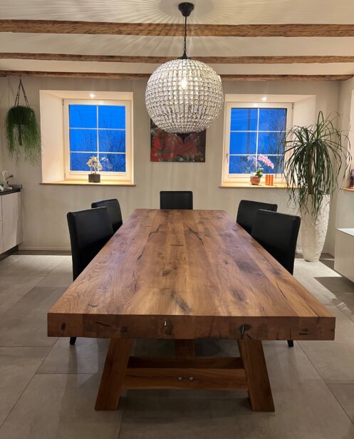 Charaktervolle Eichenbalken, meisterhaft verarbeitet zu einer eleganten 3-Meter-Tafel. Ein Unikat ganz nach Kundenwunsch.